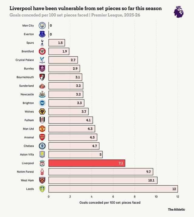 相比之下,周日是他們本賽季第5次在70次定位球防守中失球——只有諾丁漢森林(6次)、利茲聯(lián)(6次)和西漢姆聯(lián)(8次)丟得更多。